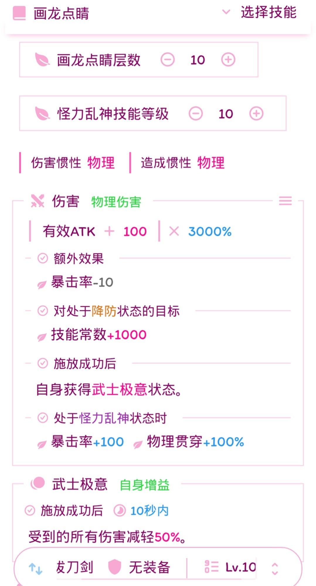 十级画龙,主要输出手段,重要的是满层的百分之50减伤,让爬爬的弹刀真的可以防下来(明明是防御的技能!为什么弹刀根本防不住呀!)