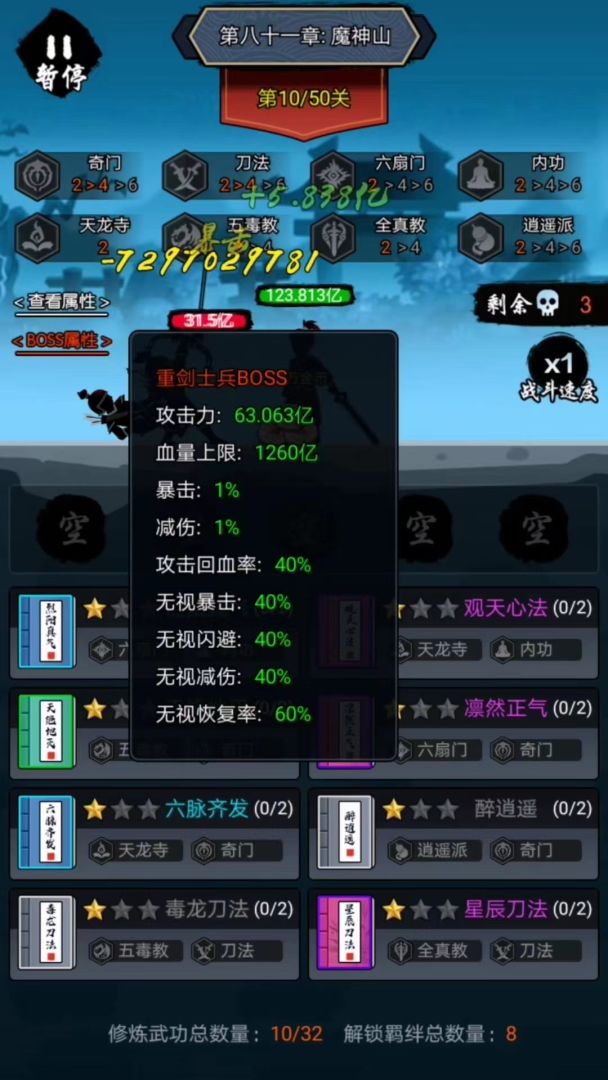 因为第10关boss攻速很低,猜测可能2全真减不了攻速或者减得很少,所以前10舍弃2全真,而选择2华山。这样拿前10有2华山,前15有4华山。会比之前好一点。