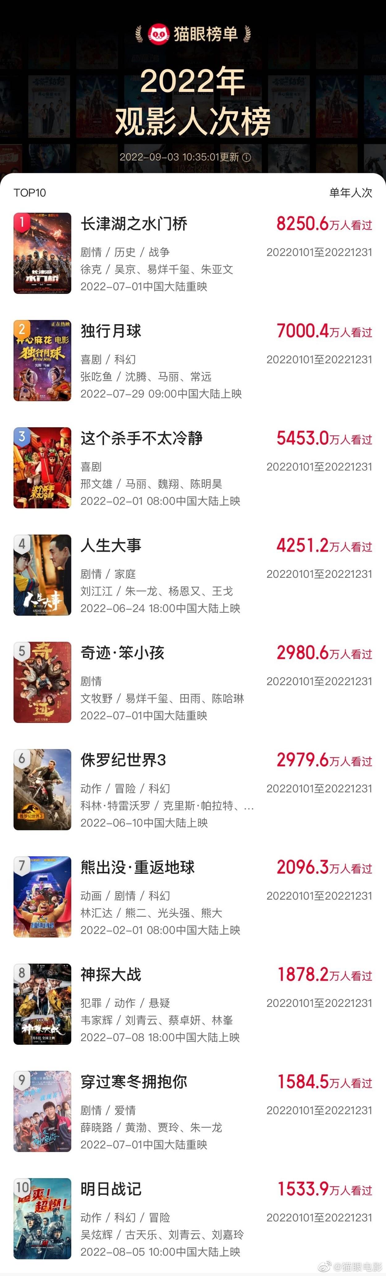 据猫眼专业版数据,由开心麻花沈腾、马丽主演的科幻喜剧片《独行月球》上映37天,观影人次已突破7000万,位列2022年观影人次榜第二名,第一名为《长津湖之水门桥》,第三名是《这个杀手不太冷静》,古天乐主演《明日战记》居第十名。