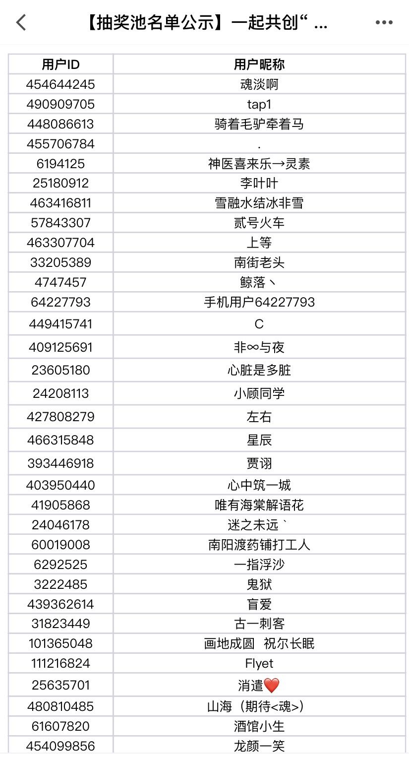 感谢所有参与本活动的玩家,本次活动先进行奖池名单公示,此名单公示至9月6日15:00,公示结束后正式抽奖,在公示期间如对名单产生质疑可联系“魂淡(酷酷代班)”(QQ1171787848),公示结束后则默认抽奖池名无误,之后不做任何修改。因数据庞大,抽奖池名单公示无法在此帖展示,现已上传至官方QQ频道