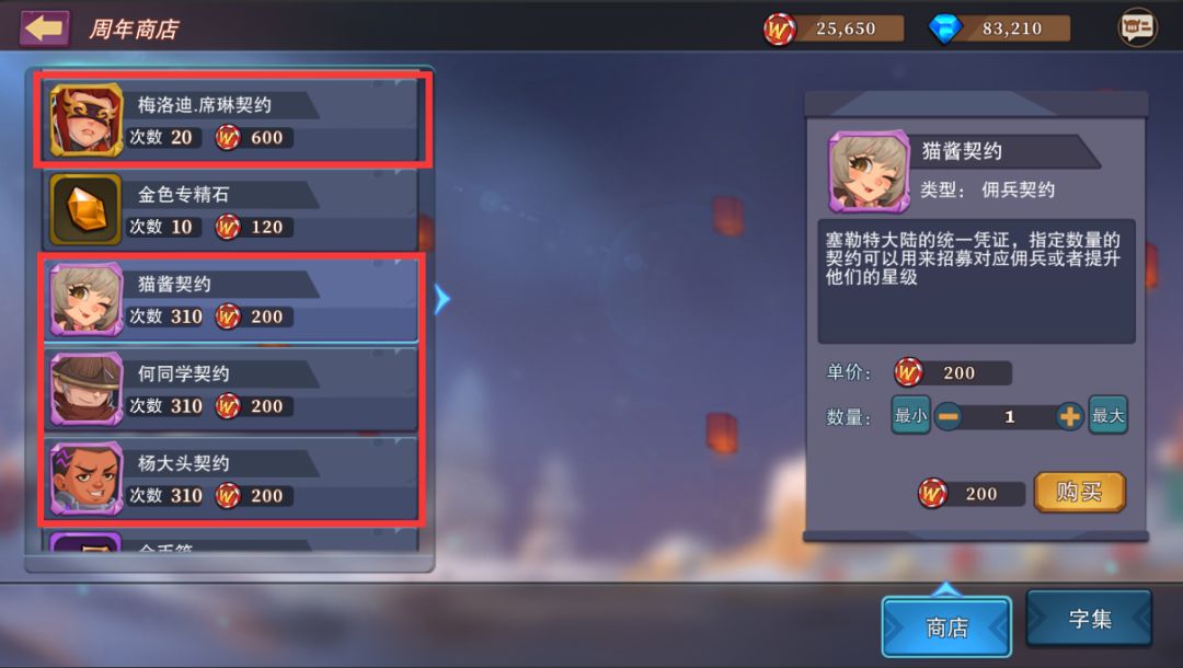 在周年庆商店中兑换获得梅洛迪·席琳、猫酱、何同学、杨大头的契约。