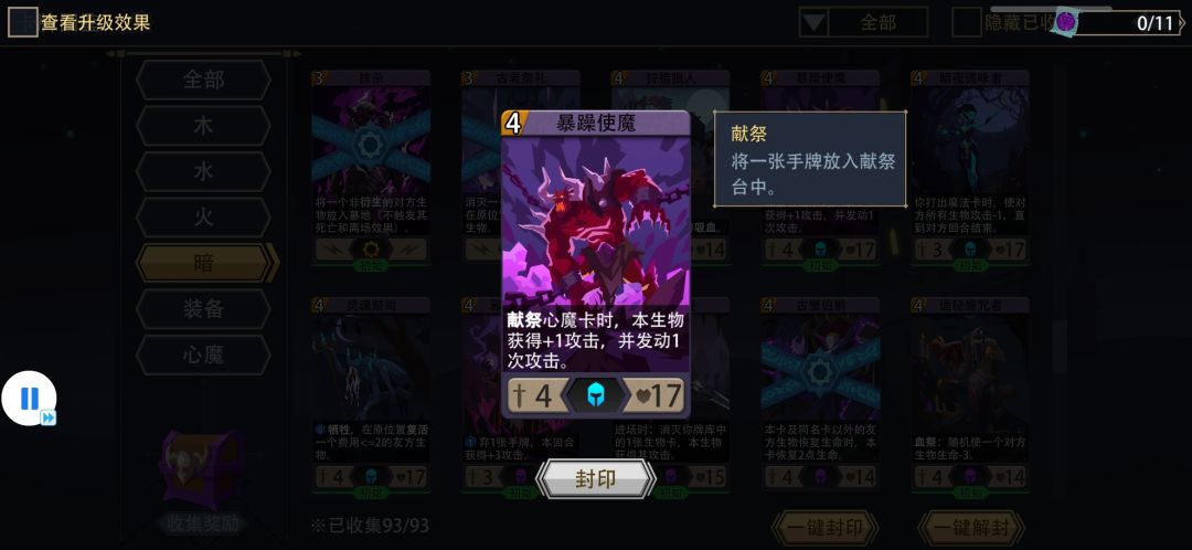 两个KEY,暴躁使魔和心魔负担,暴躁使魔效果显而易见,因为献祭心魔能够攻击的特点如果有连击手套和加攻装备,爆发会特别特别高,配合其献祭效果,心魔负担的效果是最好的,心魔恐惧能勉强替代,但是心魔恐惧污染牌库,你到后面抽不到自己牌库的卡,全是心魔,而负担配合抽牌技能能稳定过1张牌上手,其他卡比如苦痛之心和不屈恶魔都是不错的体系卡。