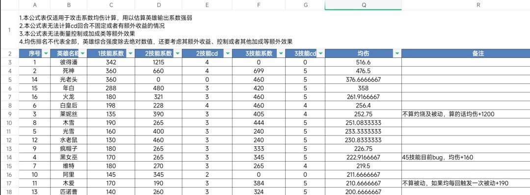 闲着没事,做了个公示表,算一算各个英雄的均输出系数。