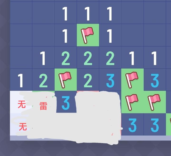 剩下三个雷,所以先判断雷的区域。得到图1,3那边有2个雷,右边一个