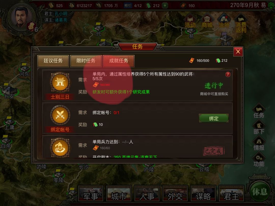 全部成就都肝出来了,感觉最难的还是这个士别三日。因为要提升五个人,属性全部90以上。