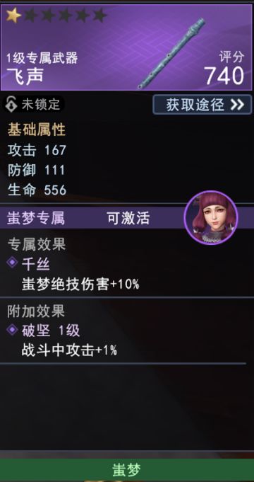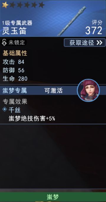 蚩梦专属武器绝品武器:万蛊噬心笛。专属效果千丝(绝技伤害+15%),附加效果破坚(战斗中攻击+2%)