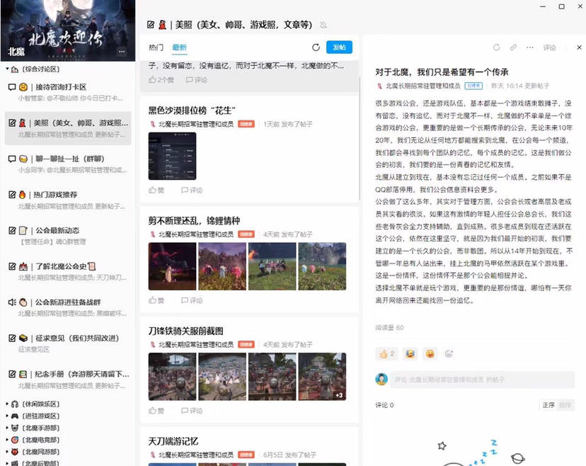 老牌公会值得你常驻守护,公会已开通QQ频道,搜索“北魔”加入我们,无论你来公会多久,无论你出于什么原因选择离开,公会都会永久记录的足迹,我们不会因为私人感情,磨灭你在公会的贡献,选择北魔,就是选择了情谊,你的加入才是我们延续成长壮大的力量。