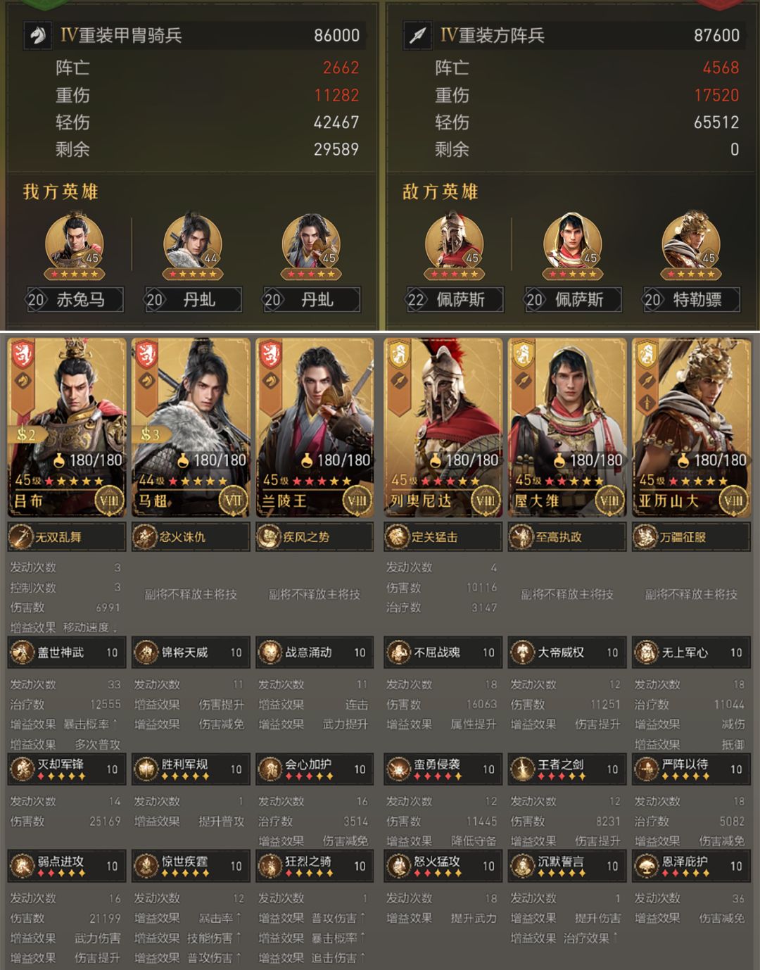 打之前我想过会有提升,但没想到提升如此之大!通过对比可以明显看得,不管是列奥尼达还是屋大维,单次技能输出的伤害明显要比打老版无双骑的时候低,这就是马超的免伤效果。