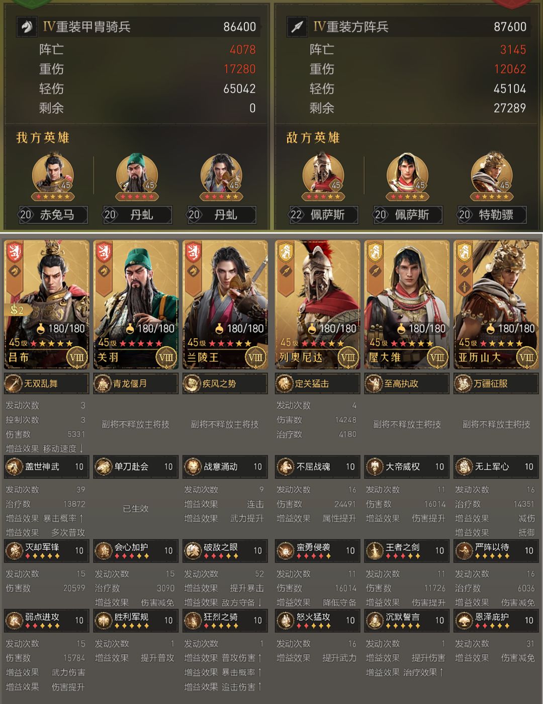 其次吕布的总技能输出不过53300,而对面总共治疗了19273兵力,加上原兵力87600,一共有106800的兵力,剩下的53500兵力都是被普攻带走的,占到了总输出的一半!