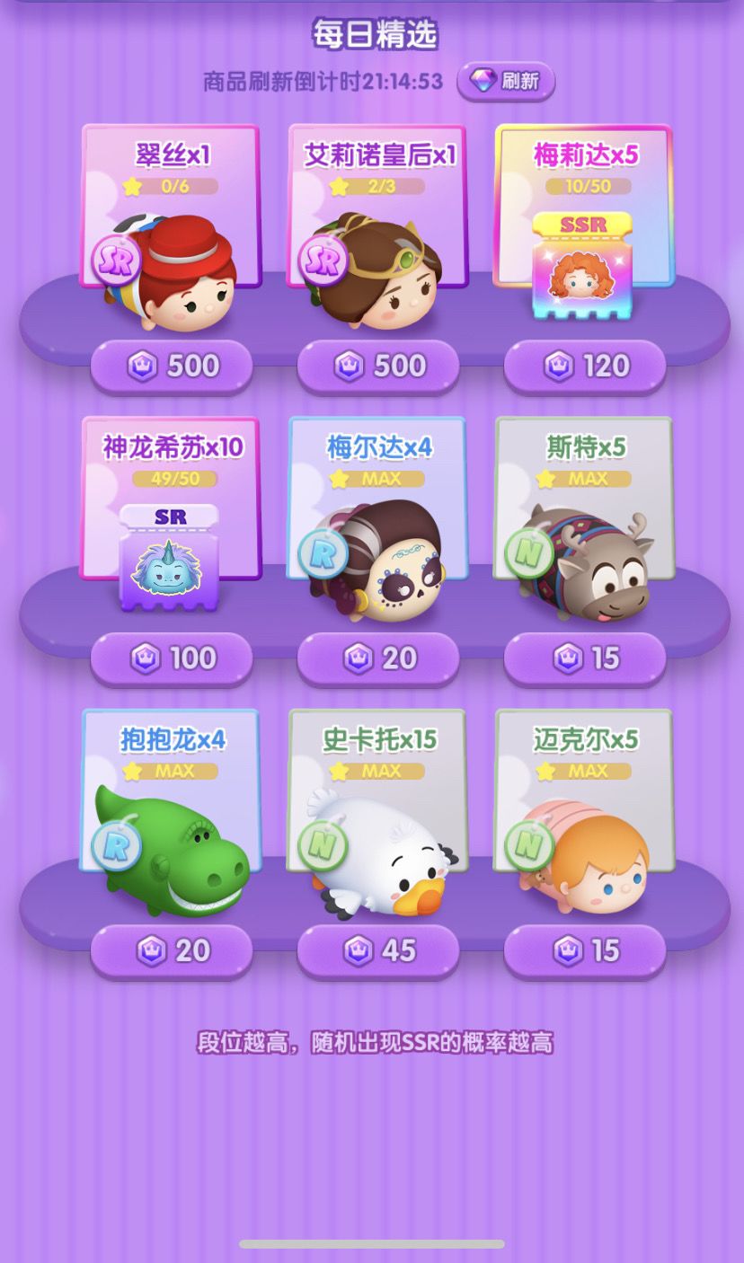 7日份的SSR碎片:爱丽丝x3、艾莎x4(1片来自扭蛋)、朱迪x1、辛巴x3、云妮x4、史迪奇x1、大白x1、毛怪x2、木兰x1、乐佩x1、爱丽儿x1、胡迪x6(5片商城兑换)、巴斯x3、闪电麦昆x2、灰姑娘x3、爱洛x5、尼莫x2、匹诺曹x6、福运米奇x1、乐乐x2、斑比x1