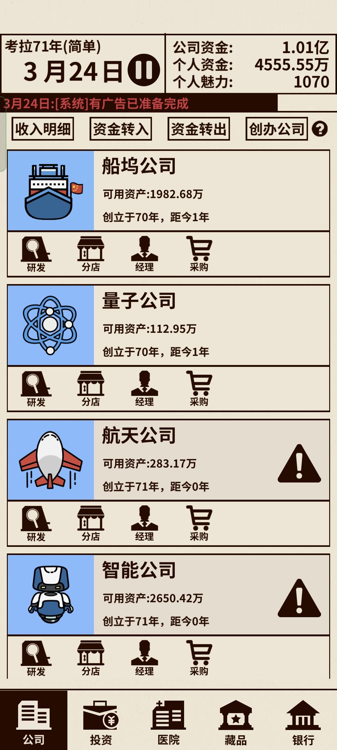 截图是刚败家完,没啥资产截图是写笔记的时候,可以看到是船坞公司最赚钱,还有两个大公司是刚开起来试玩股票,感叹号是因为只在投钱研发技术,一个员工都没有,除了研发还要每天几大万供着