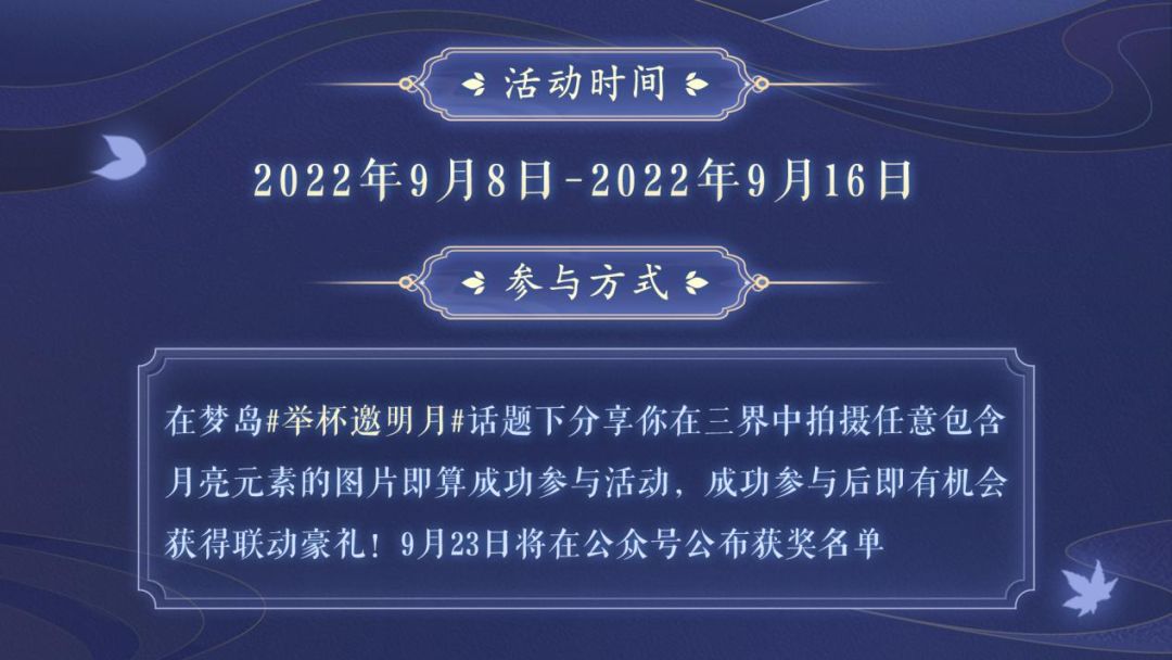 在梦岛#举杯邀明月#话题下分享你在三界中拍摄任意包含月亮元素的图片即算成功参与活动,成功参与后即有机会获得联动豪礼!9月23日将在公众号公布获奖名单。