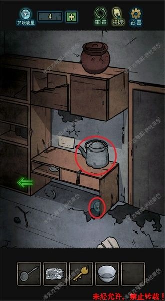 78.点击箭头进入下一个场景,点击桌子上面的水壶,桌子下面还有一个能量别忘了。78.1