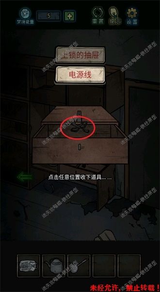 82.切换到下一个场景,点击水壶下面的抽屉,用获得的青色钥匙将抽屉打开,可以获得一条电线。82.1、82.2