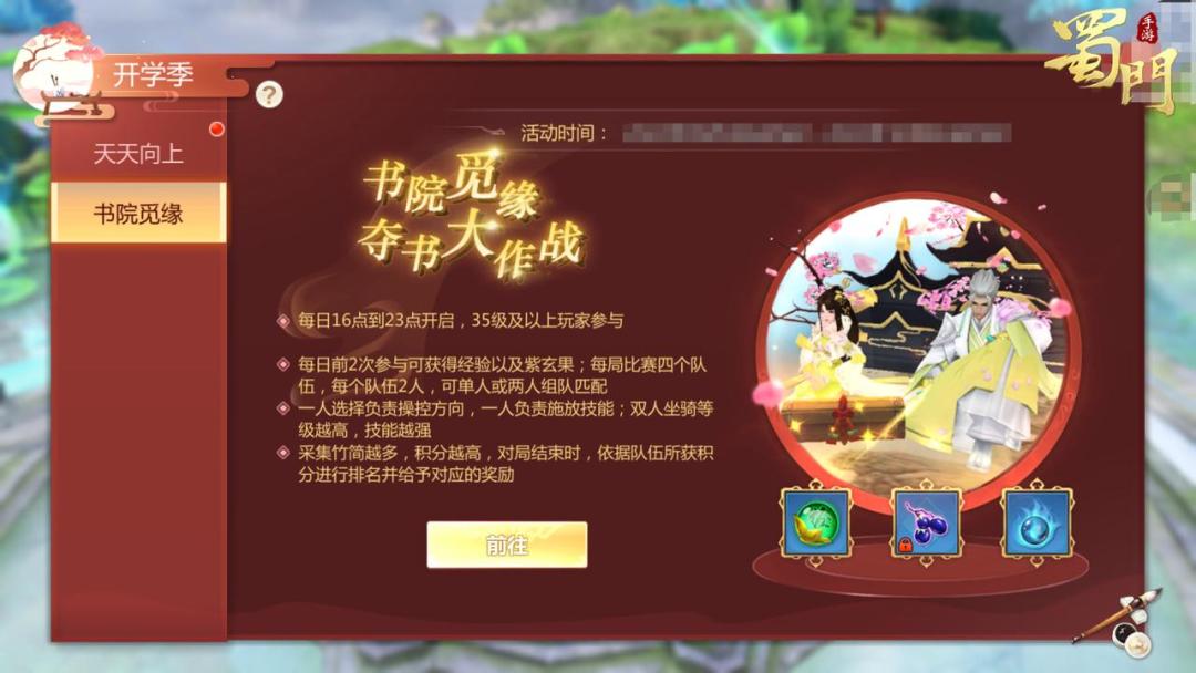 活动时间:9月6日10点-9月9日5点活动内容:活动期间,每日16-23点,35级以上玩家可参与。每局比赛四个队伍,每支队伍2人,可单人或两人组队匹配,一人负责控制坐骑方向,另一人负责技能释放,坐骑技能各不相同,双人坐骑等级越高,技能也就越强。最终根据每支队伍采集到的竹筒数量进行积分排名并给予对应的经验、紫玄果奖励。