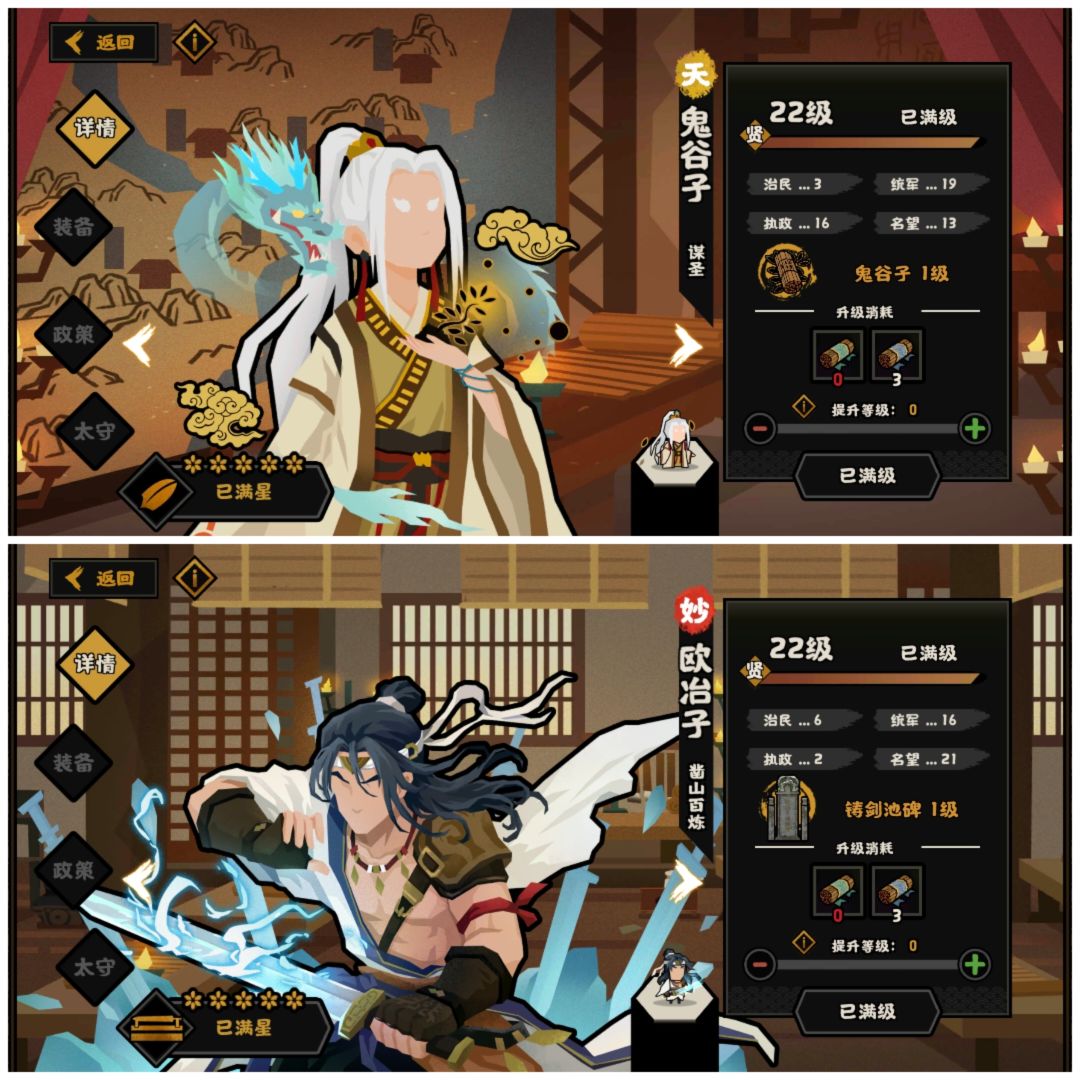 图中是22级的鬼谷子和欧冶子,鬼谷子的总属性加成是51点,而欧冶子只有45点和地级名臣相当。此外,妙级名臣升级所需的纹石和经验都是和地级名臣相当。唯一不同的是地级名臣招募需要20个信物,而妙级需要50个信物。