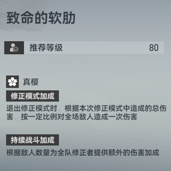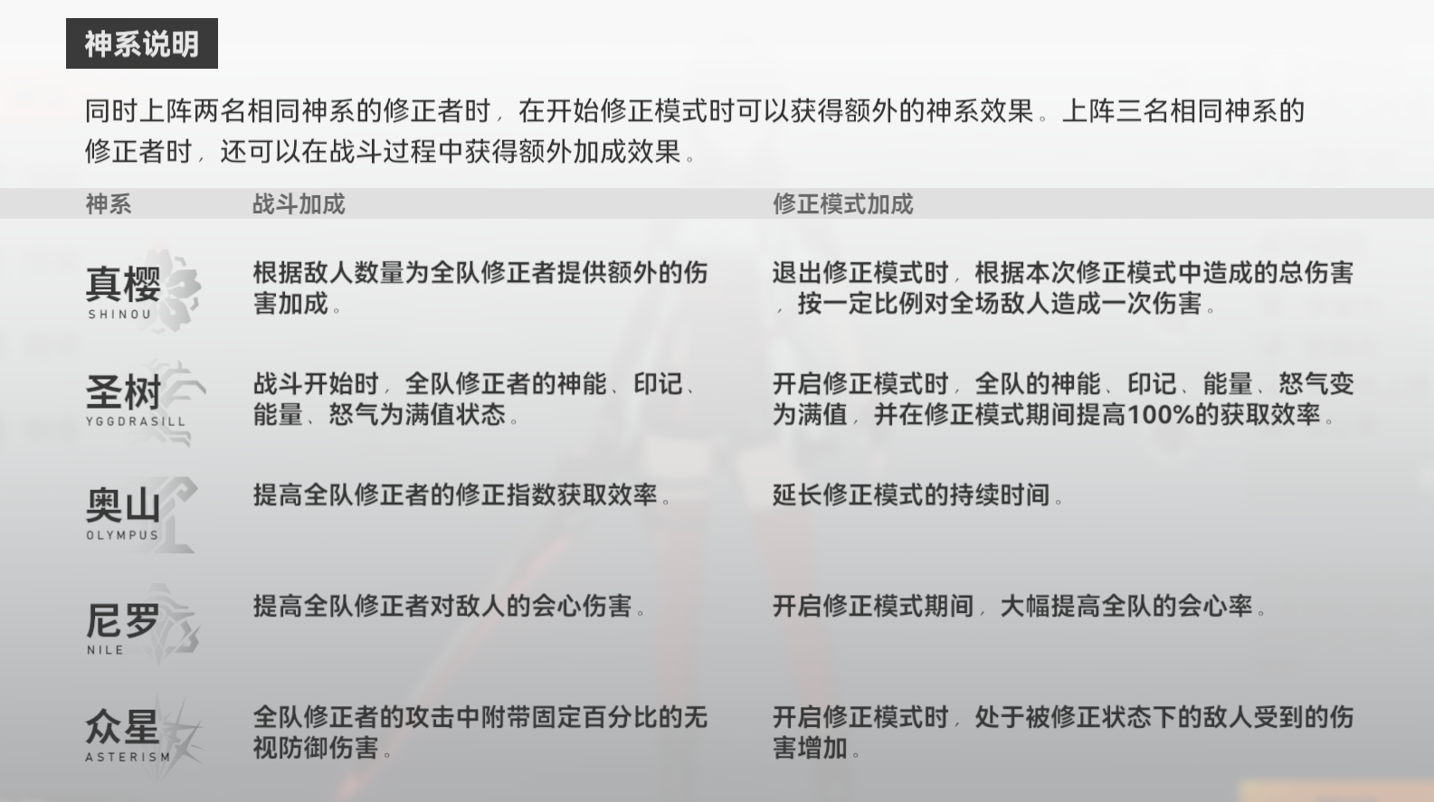 两名相同神系的修正者会获得增强效果,三名相同神系则会额外获得一个效果。例如两名圣树系修正者进入修正模式后会获得满机制值,三名圣树系修正者开局就会获得满机制值。三名真樱系修正者会有额外的伤害加成。