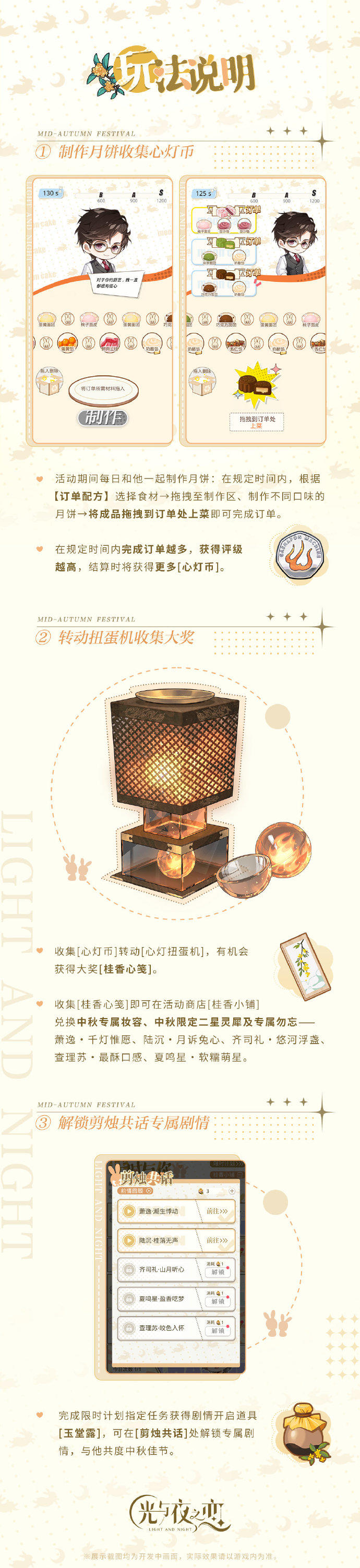> 活动概要:时值桂花飘香、盈盈满月的好时节,和他一起制作各种口味的月饼吧!参与活动即可体验中秋专属剧情,获得中秋限定灵犀、专属妆容等丰富奖励。