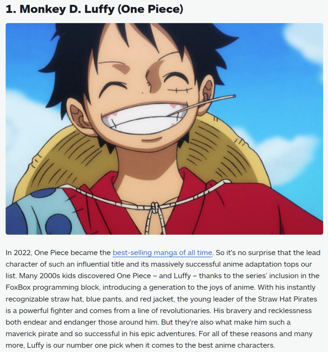 但我更愿意相信,法国二次元们是真的喜欢《航海王》。和国内呈现出的“散装”态势不同,我们眼里的“民工漫”,在法国粉丝眼里是东方的文化瑰宝。据说,《航海王》海外发售的一亿册里,法国二次元们贡献了其中的2800万册。而在IGN进行的“最佳二次元角色TOP25评选”当中,路飞更是排名第一。