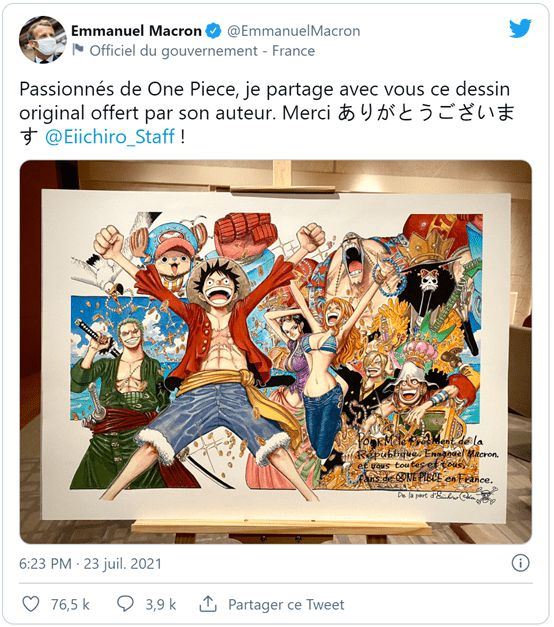 法国总统马克龙也曾在推特上晒过自己收到的尾田荣一郎签名原画,平时只有几千点赞的他,这条推文收获了9.5万赞。