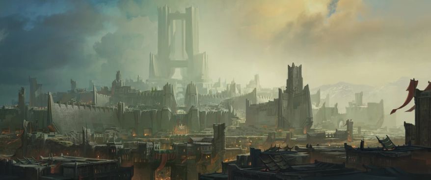帝国的力量和掌控感同样体现在诺克萨斯的城市建筑上。诺克萨斯的城市建筑风格庄严、街道狭窄幽闭、房檐都有墙垛、城门雄伟宏大,而且非常适于防守作战——任何想靠武力占领某座诺克萨斯城市的敌人都将面对顽强抵抗,因为即使是再简陋的住房,也会建造得像一座堡垒。