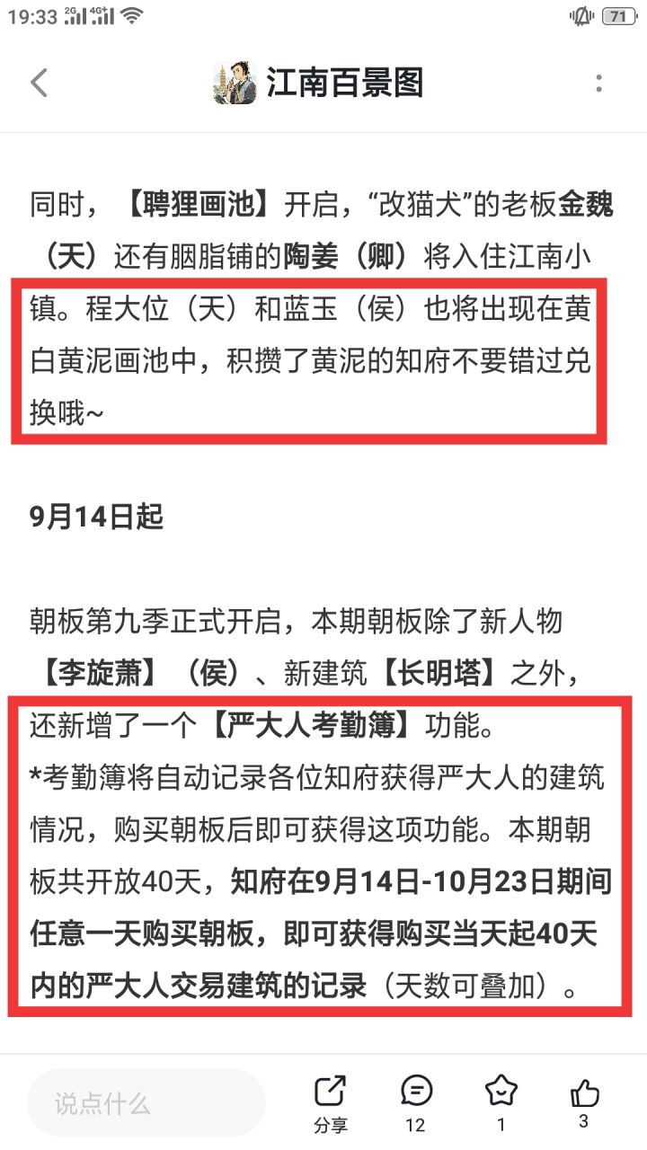 方才,官方发布九月中旬活动预告,新一季朝板将包含有效期40天的「严大人考勤簿」功能,可记录玩家每天获取严大人建筑的情况,和小程序的「严大人日历」功能一模一样。