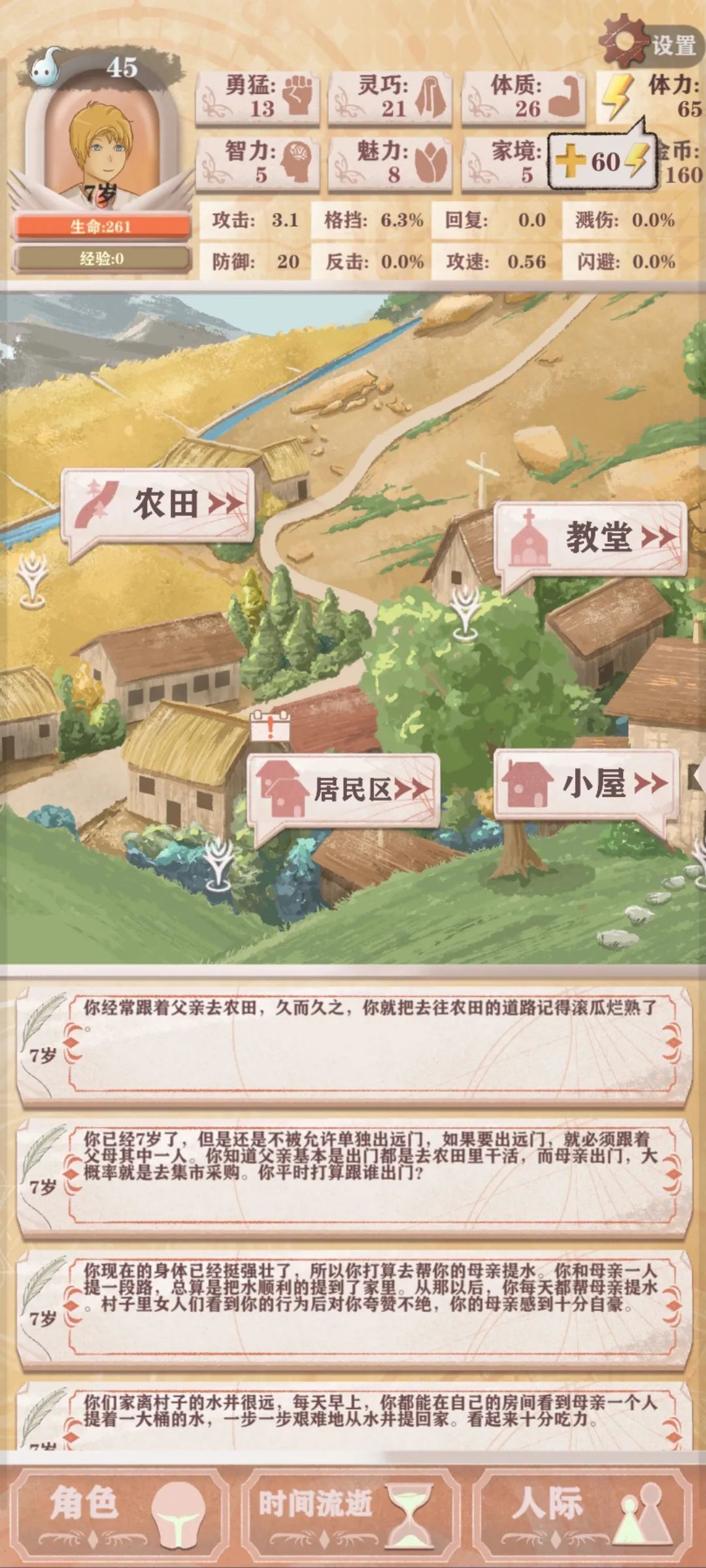 《异世轮回录》的游戏界面构成十分简单,大致可以分为三个部分。上方是玩家形象,以及年龄,生命值和战斗力等一系列属性数据;下方是此次次轮回经历的事件记录和三个功能栏位,角色栏可以查看自身属性、装备和现阶段习得的技能,人际栏可以查看与NPC的关系和好感度,时间流逝按钮用于行动点耗尽时结束回合。