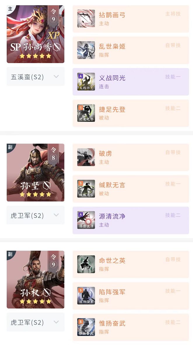 推荐站位:2(孙坚)3(孙权)5(SP孙尚香)推荐加点:孙坚全武力吃八阵;SP孙尚香全速,孙权全防;