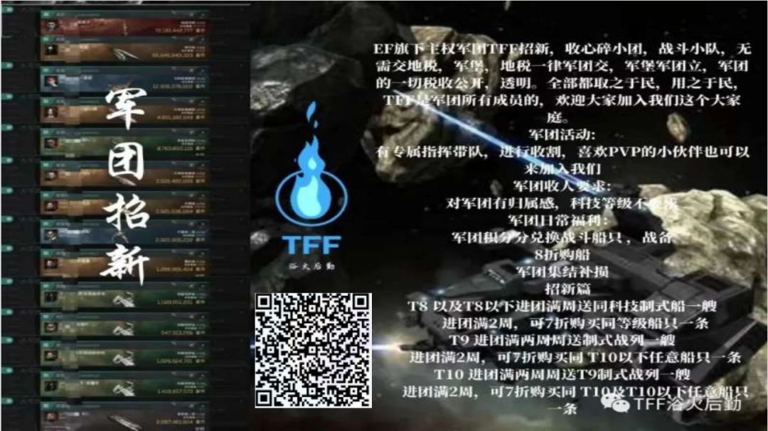 EF旗下周年庆阅兵主权军团TFF招新,7块主权,绝经历史最久老牌主权军团,收刷子,附属小团,战斗小队,欢迎合团,附属,现有天使地7个主权,3级主权2个,2级主权2个,1级主权3个,三级赏金加成有双10级异常生产,多块旗舰异常地,有个堡坑位,团内日常组织团建活动,有大佬组织带团员刷脑插副本。军团的一切税收公开,透明。取之于民,用之于民,欢迎大家加入我们这个大家庭。