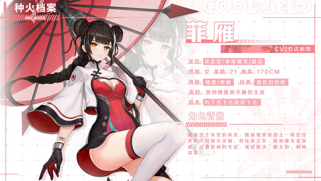 菲雁身穿改良旗袍,编着双丸子麻花辫,手执特制红伞,自有一股轻灵之气,秀雅曼妙,玲珑有致。闲时与花草间蝴蝶说笑,倚长椅晒太阳,岁月静好,悠闲自在,有着让人放松的磁场。即便在战场上,她的一举一动也透着优雅和惬意,起舞旋转之间便可杀敌于无形,轻如拂尘,毫不费力。