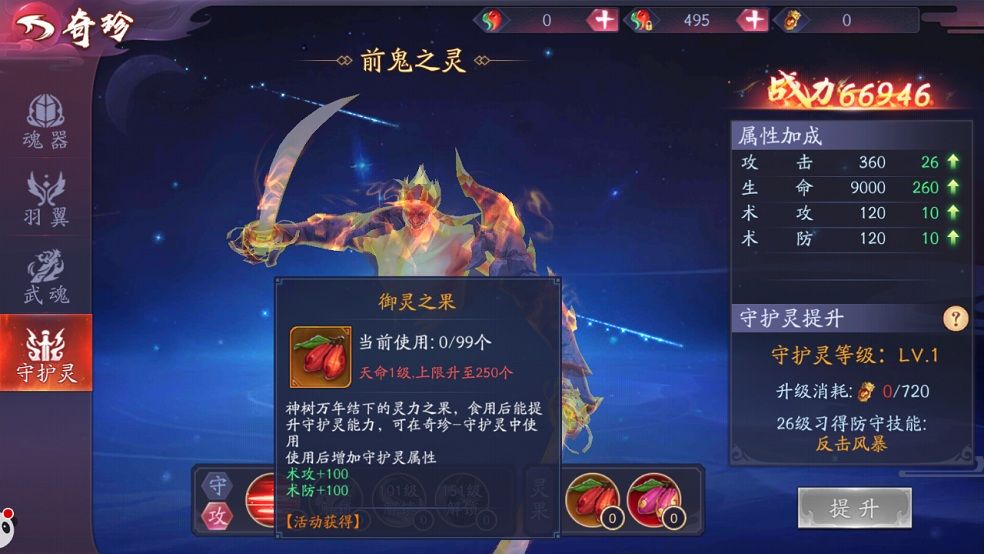 降妖师使用战功可提升守护灵的等级,解锁技能(攻守2组,共8个技能),增加属性。除了升级以外,降妖师还可使用御灵之果和神明之果,增加术攻、术防。