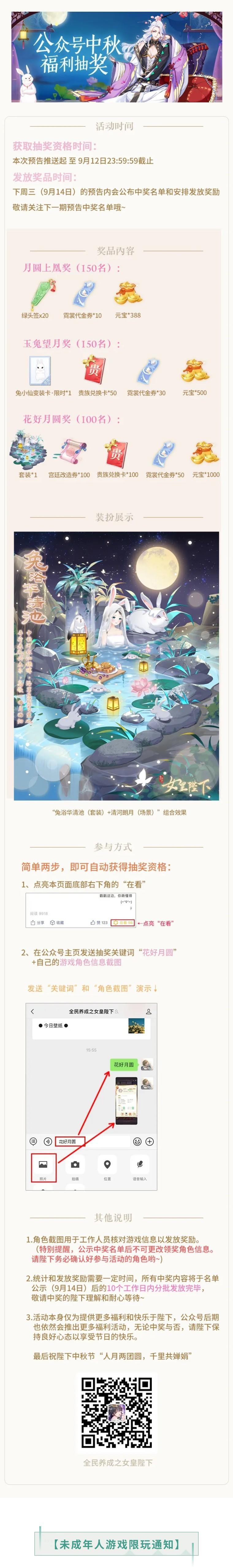 结合《关于进一步严格管理 切实防止未成年人沉迷网络游戏的通知》与实际放假调休安排,今年中秋节假期前后,《女皇陛下》在中国大陆地区运营限玩执行如下: