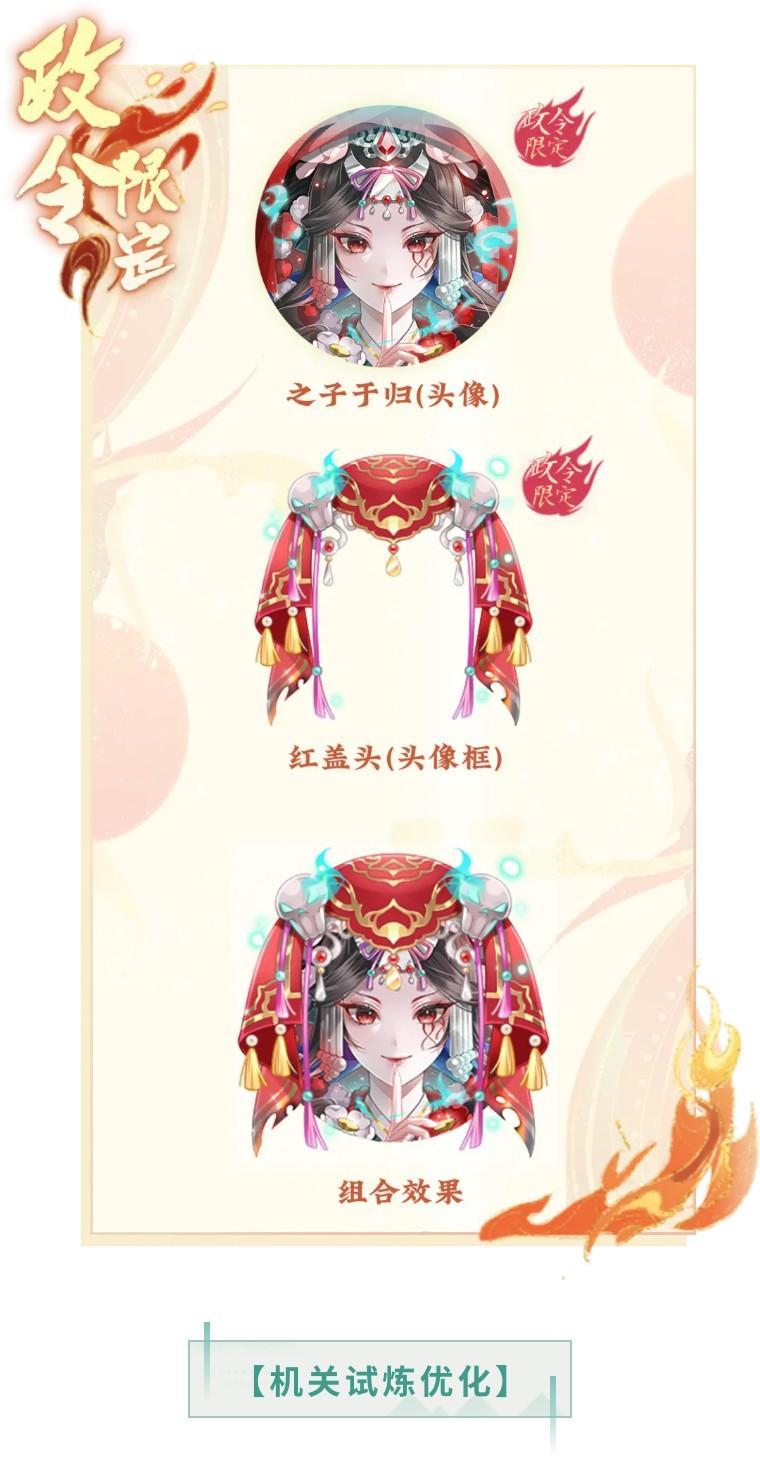 新的一期上凰政令将于9月12日0:00开启,提升政令等级,购买进阶方案,有机会获得全新头像“之子于归”,头像框/气泡框“红盖头”