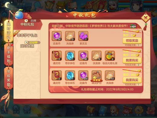 5)中秋礼包:9月8日维护后-9月28日24:00,服务器50级及以上的玩家可前往奖励界面领取中秋礼包。