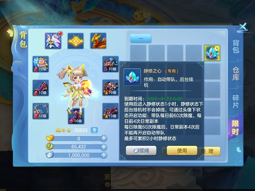 4)节日减负:9月15日维护前,商城限量折扣出售道具“静修之心”,使用后可获得60分钟静修状态(最多累积120分钟),静修状态下后台挂机时不会离线且可开启带队除魔每天前60环、每天前4次副本任务等功能。