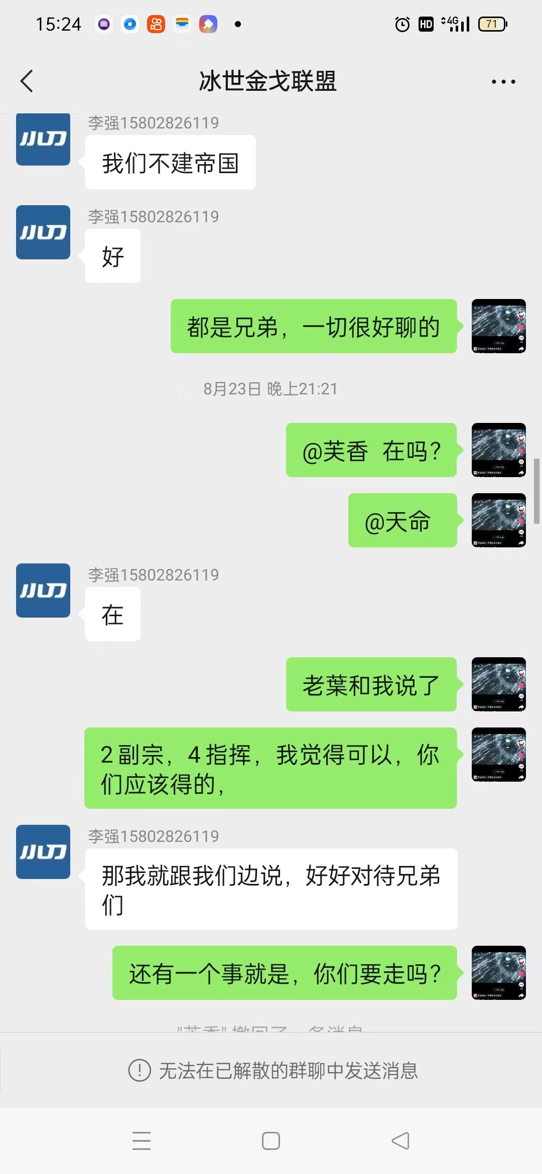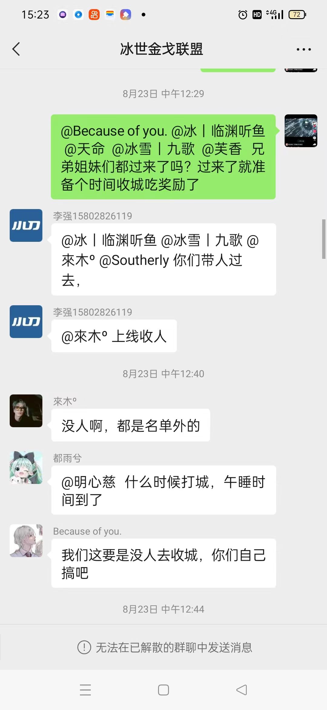 再说说开战前夕,如图一,二手车在他们群里发出打架的问题,其实当时金戈并没有通知,好多人也是半道知道的,也可以侧面说说此次战争是因为两人私下的问题引发昔日盟友的对战,元子在打架的时候,第一天晚上还在战斗,第二天就躲进密州,二手车是个49级的小号,可以说完全给冰世出了个馊主意,低估了金戈的战斗力。注:大部分人都60,还可以说就算种地的甚至都没有49。可以说是节奏狗带的不行