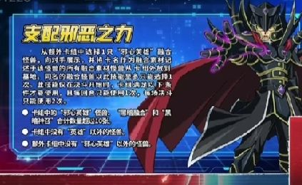 支配邪恶之力。将自己额外卡组《1只“邪心英雄”融合怪》上的有卡名记述的《所有素材怪兽》,从卡组外放到墓地。每回合1次,最多2次。对卡组有一堆限制条件。