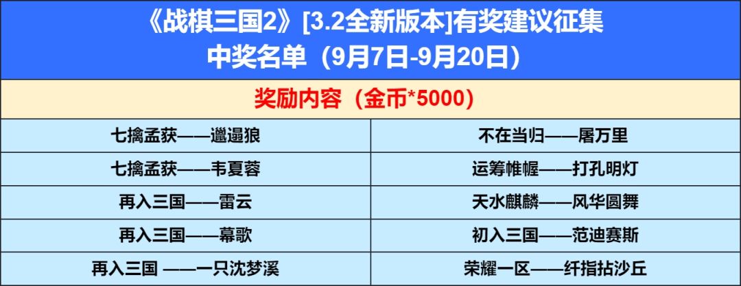🎁《战棋三国2》[3.2全新版本]有奖建议征集(9月7日-9月20日)中奖名单公布啦!❤恭喜以下主公❤