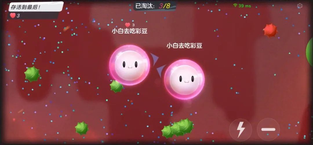 在这一关卡中,每位球宝最初都有三颗心,就是下图中昵称上方的红心,被敌人吞噬就会减少一颗心,当红心全部消耗完就会惨遭淘汰。