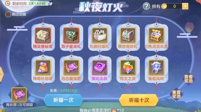 2.许愿前需选择7个奖励放进秋叶灯火中,另外有8个为固定奖励,点击查看奖池可显示加入奖池的15个奖励,每次许愿都会获得奖池奖励之一;