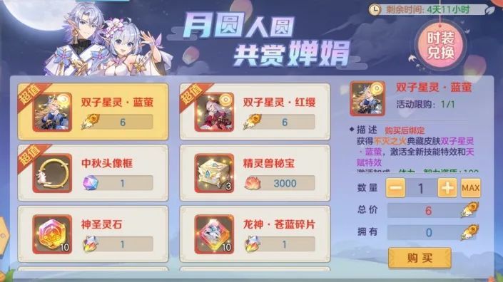 使用永恒焰翎、莲花浮灯、虹彩光珀等兑换稀有奖励:双子星灵、中秋头像框、精灵兽秘宝等期待大人们的光顾!