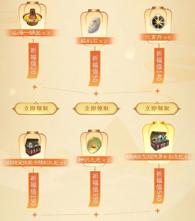 祈福奖励:山海一锅出X3、鹞彩石x2、化育丹x6、3级骑宠技能书随机礼包x1、神识之元 X2、嫦娥发型服饰男女自选包X1