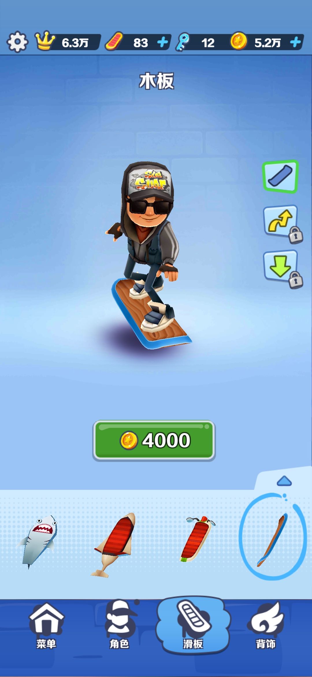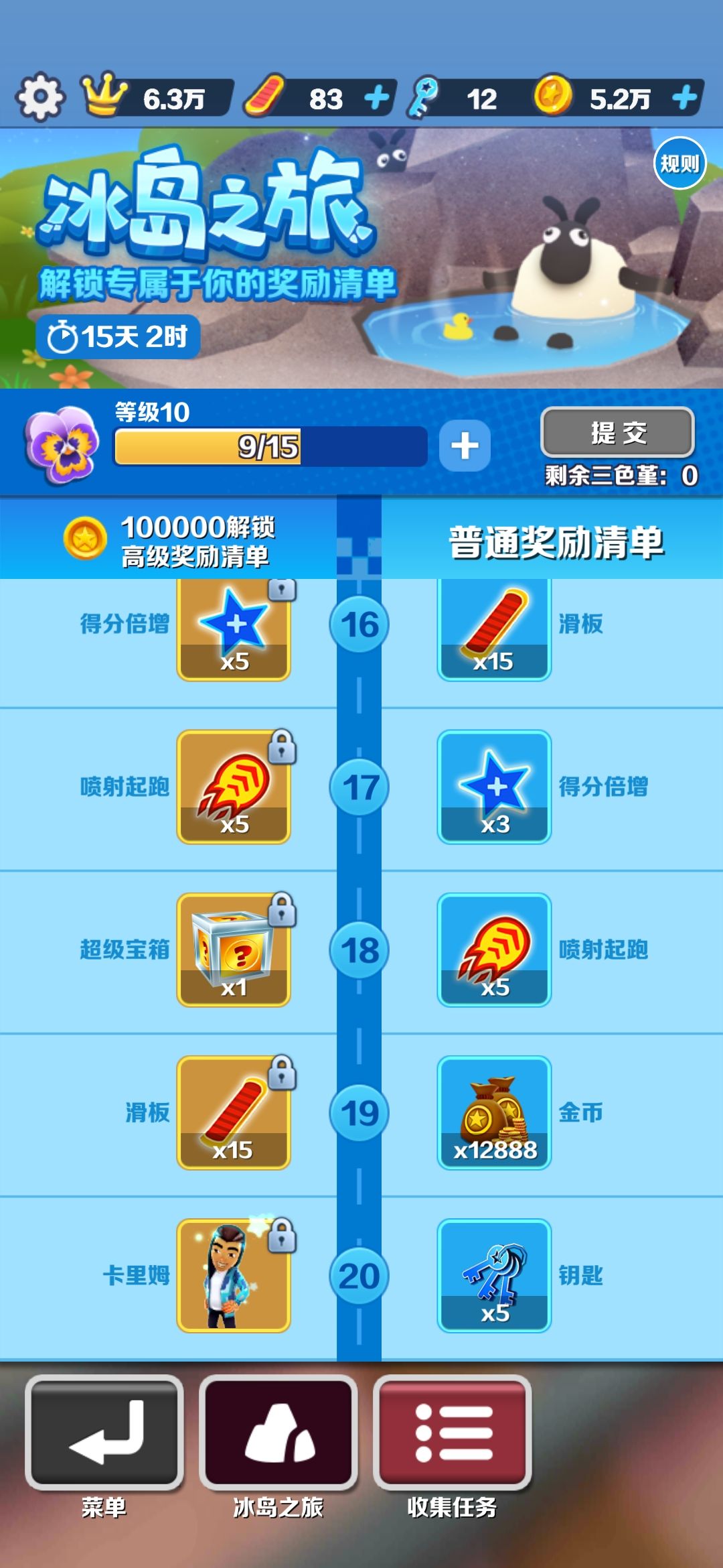 还有另外一个活动就是冰岛之旅,在无限模式收集三色堇以及完成相应的任务提交到冰岛之旅的页面,累计升级奖励并使用10w金币开通高级奖励,就可以获得麋鹿滑板和卡里姆人物。这个相对简单一些,但是人物和麋鹿滑板都无其他特殊效果。所以如果是想要有效果的滑板,我更推荐去形象里买一个滑板,就像机车,街头滑板,大白鲨,木板,怪兽,超级英雄等等这些,他们都只需要金币,而且都不超过5w金币,那个木板只要4000,后期还可以通过钥匙解锁他们的特殊技能,而且基本都是两个特殊技能,性价比比冰岛游戏更高。