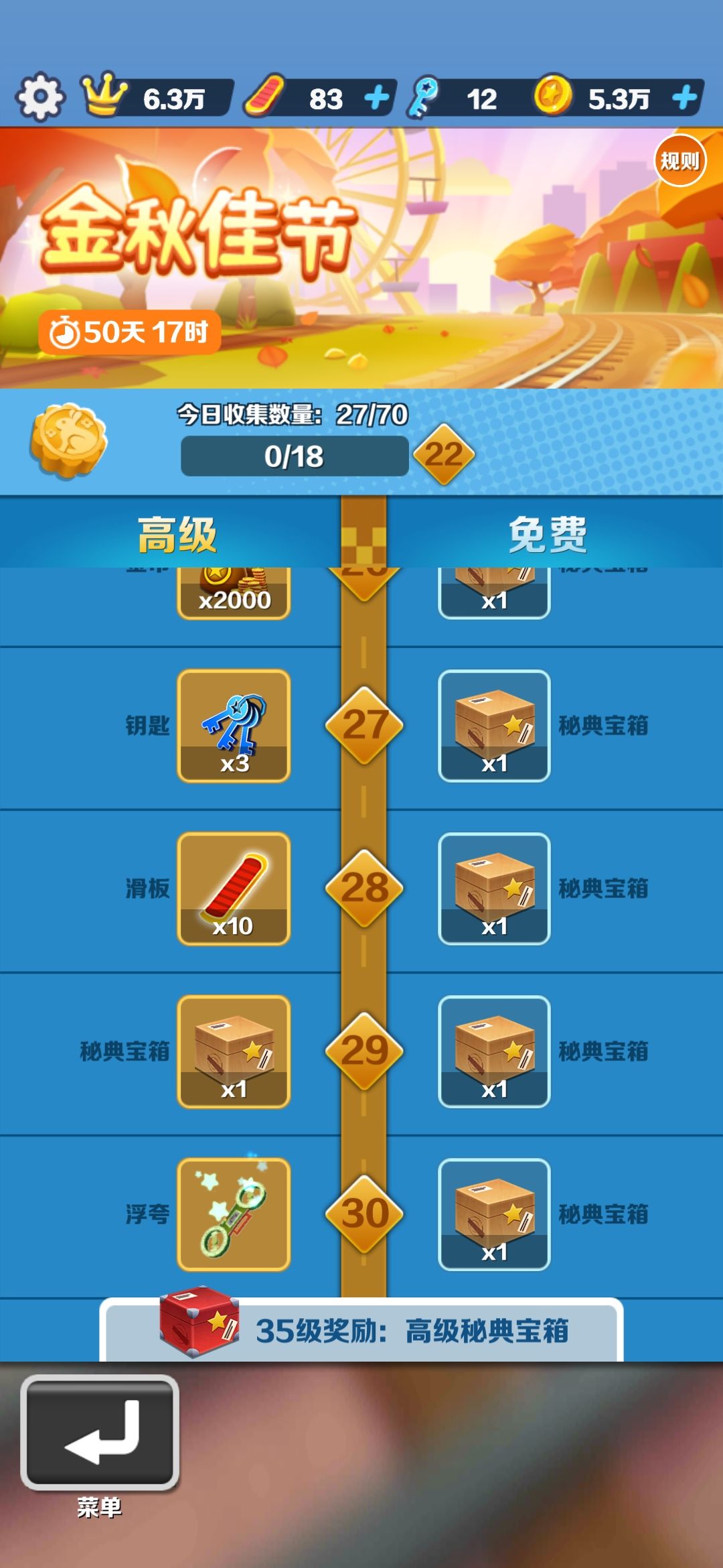 对于新手来说,如果想要零氪拿到好一点分人物和滑板,最近的几个活动其实比较的友好,其中一个是秘典,在无限模式里面收集月饼,并用66个钥匙开通高级奖励,(钥匙在平时的抽奖和活动中是会送的,无限模式也可以收集到,所以几天就能攒到)升级之后可以获得两个滑板和一个人物,这两个滑板一个是奥尼一个是浮夸,奥尼的特殊能力是空中滑翔,这是普通滑板所不具有的,浮夸则就是二段跳,还有一个比较特殊的就是与超级小黑搭配加五倍得分,这点是很多人比较感兴趣的。而这个超级小黑就是秘典里的人物奖励。