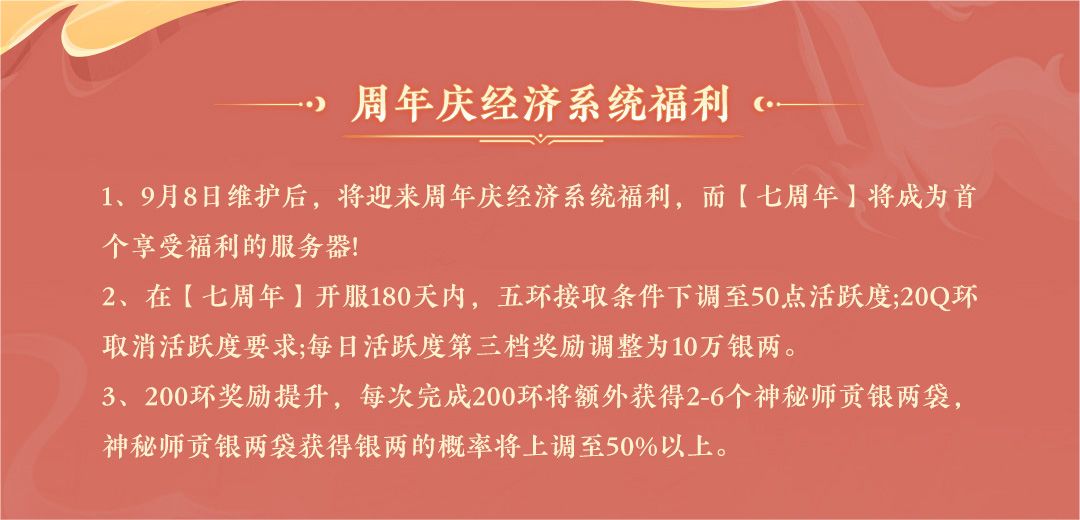 在【七周年】开服180天内,五环接取条件下调至50点活跃度;200环取消活跃度要求;每日活跃度第三档奖励调整为10万银两。