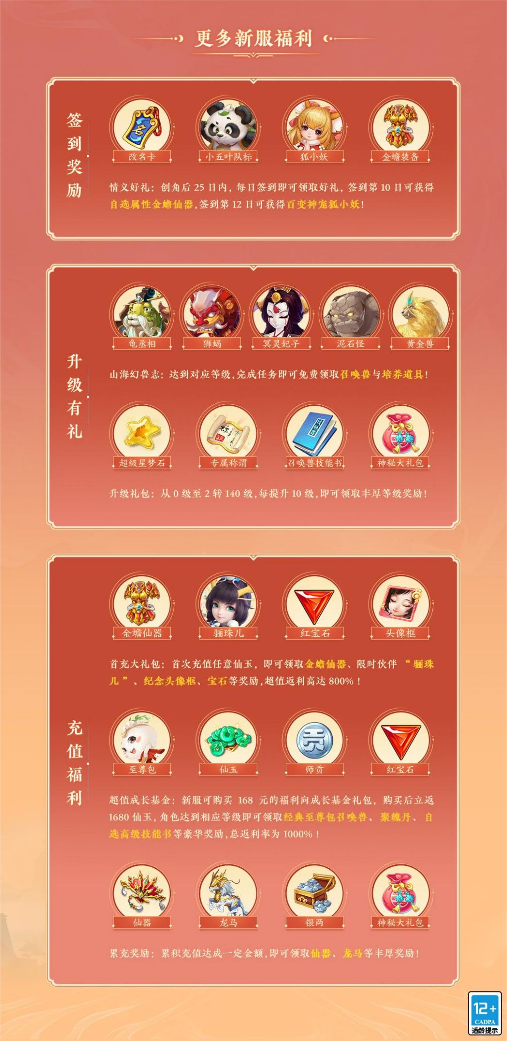 新服创角后25日内,每日签到即可领取好礼,签到第10日可获得自选属性金蟾仙器,签到第12日可获得百变神宠狐小妖!