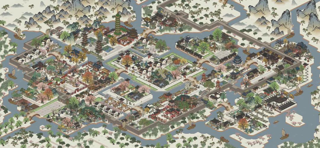 这一部分稍微借鉴了另一个大佬的想法,主要是不知道怎么摆织布坊和裁缝铺,然后摆了个小公园,可以赏花饮酒。同样也为了消耗民居,建了个河边小街。