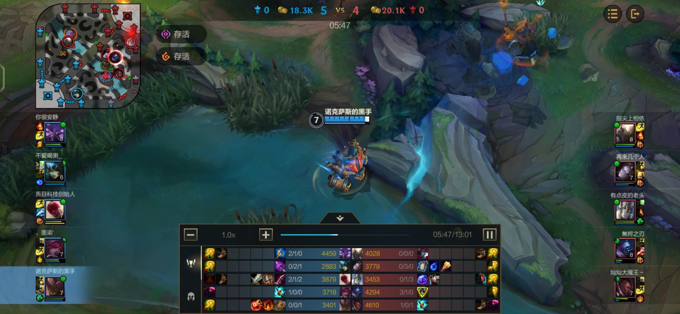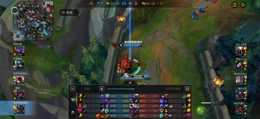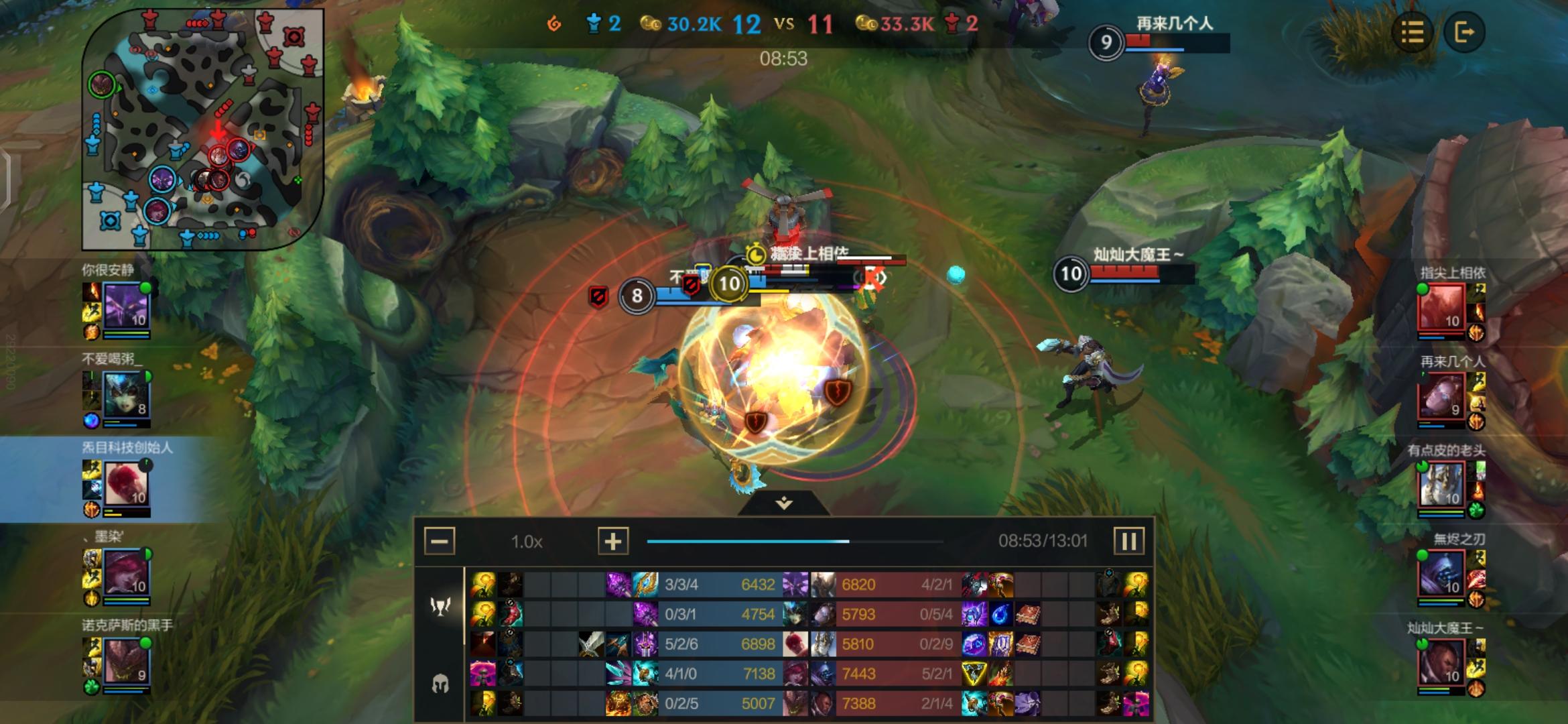 第三波7分钟这里,我刚好够买装备了,我打算回家买装备然后来拿先锋,我发了拿先锋的消息,我也发了我要买装备的消息(回放看不见),他们自己打起来了。本来我来的也不算晚,这波完全打赢了,结果7分50秒左右盲僧自己q上去还带着我送了,我也没说什么。
