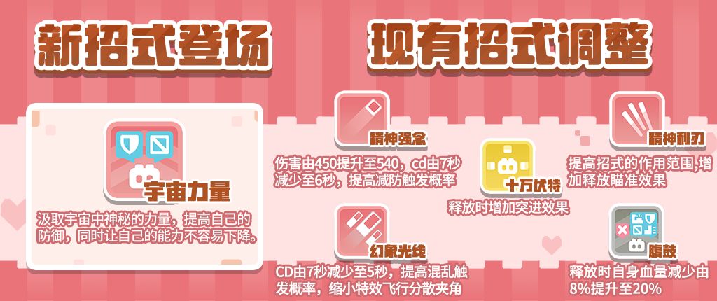 【1】精神强念:伤害由450提升至540,cd由7秒减少至6秒,提高减防触发概率。