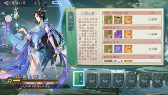 连续七天,每天完成各种日常任务可以领取侠客玉积分和活动兑换道具月枝。积分累积到一定程度可以领取相应奖励。终极大奖是阳刺客本体1张,七天累计可获取兑换道具月枝49个。